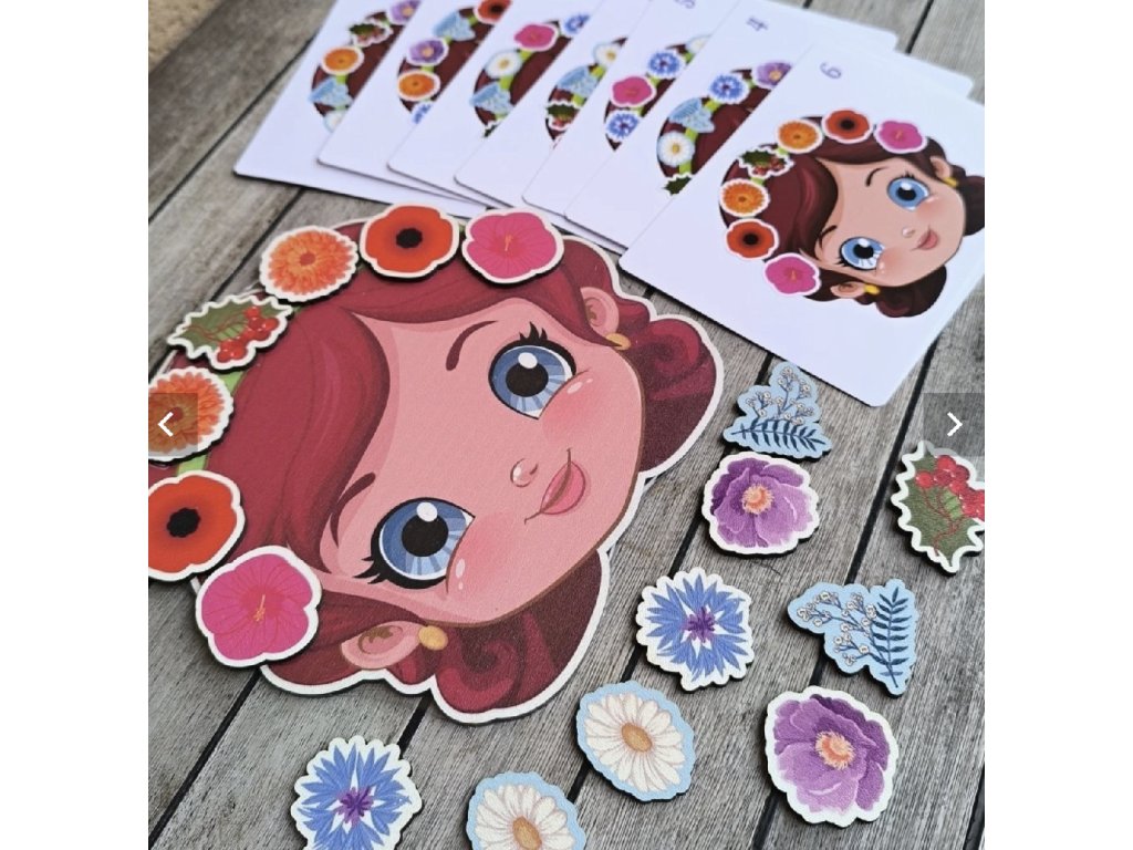 Hra s holčičkou a kytičkami KVĚTINOVÝ VĚNEČEK včetně předloh na kartičkách na procvičení zrakového vnímání a jemné motoriky. 16 kytiček (8 párů), podložka holčička, 8 karet s předlohami. Ozdobte holčičce věneček kytičkami dle fantazie, nebo zadání na kartičkách. Kytičky můžete použít i na další vlastní aktivity, třídit do párů, počítat, pro suché smyslohraní na jarní téma... V sadě je přiloženo i platíčko samolepících koleček suchý zip 1,5 cm, které můžete/nemusíte použít. Procvičí zrakové vnímání, jemnou motoriku, soustředění.