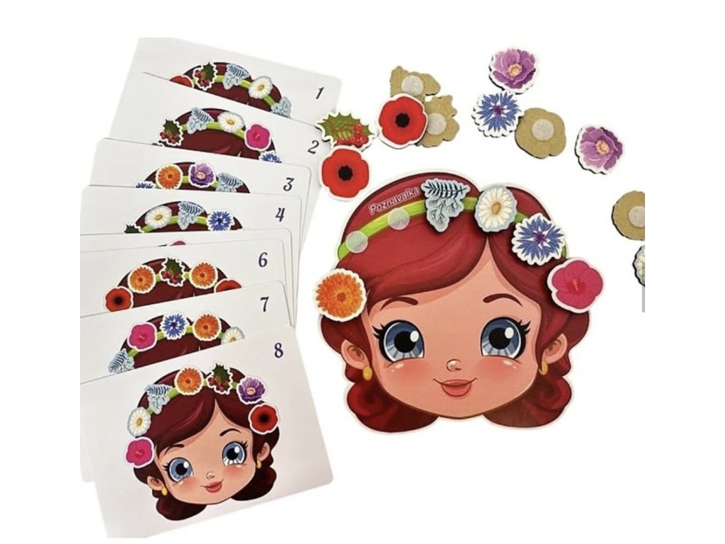 Obsahuje: 1 ks podložka-holčička, 16 ks kytiček (8 párů), 8 karet s předlohami