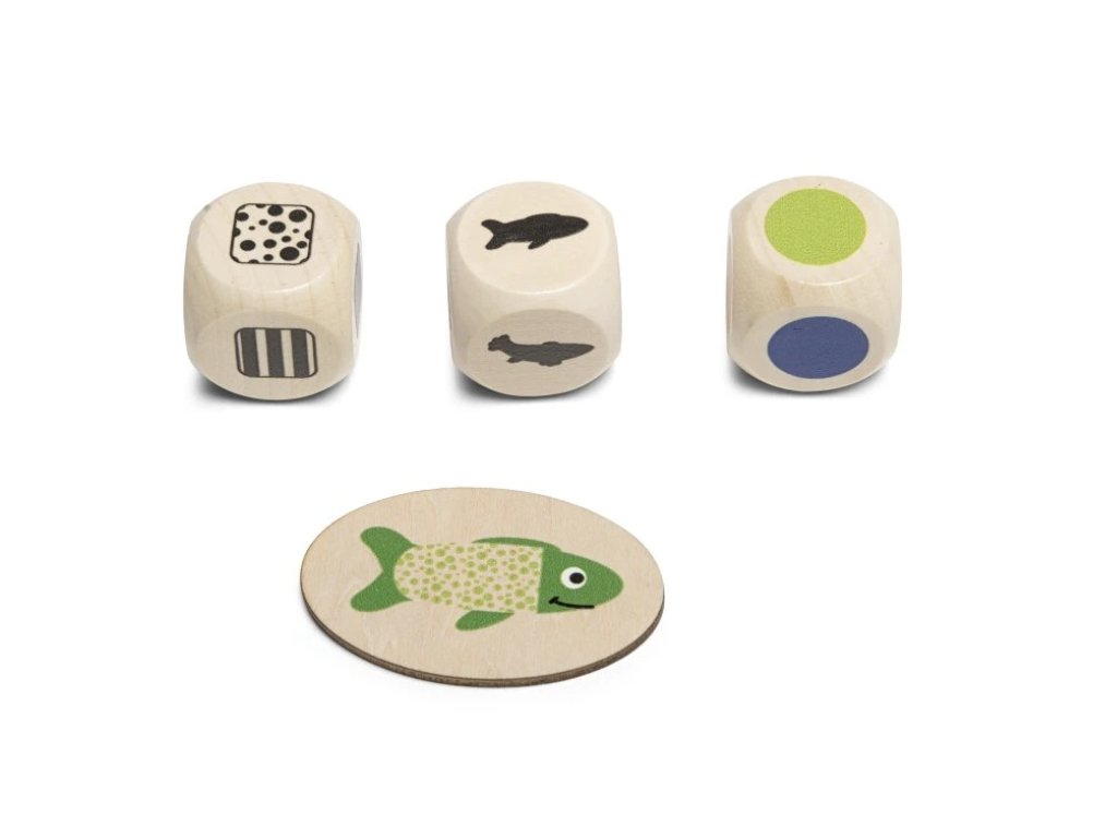 Logická a postřehová hra pro 2-4 hráče od 4 let. Hoďte třemi kostkami a najděte rybu se správným tvarem, barvou a vzorem. Výsledkem hodu kostkami je kombinace vlastností. Například hledáte kulatou rybu se zeleným, puntíkovaným vzorem. Kdo bude nejrychlejší? Pokud je hra pro mladší děti příliš složitá, odložte kostky a použijte karty. Kdo jako první najde rybu na kartě? Více herních možností znamená, že s touto hrou se nudit nebudete!