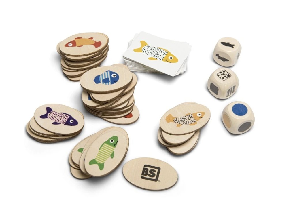 Hra obsahuje: 54 ryb, 6 x 4 x 2,6 cm, 54 karet, 7,5 x 5,5 cm, 3 kostky.